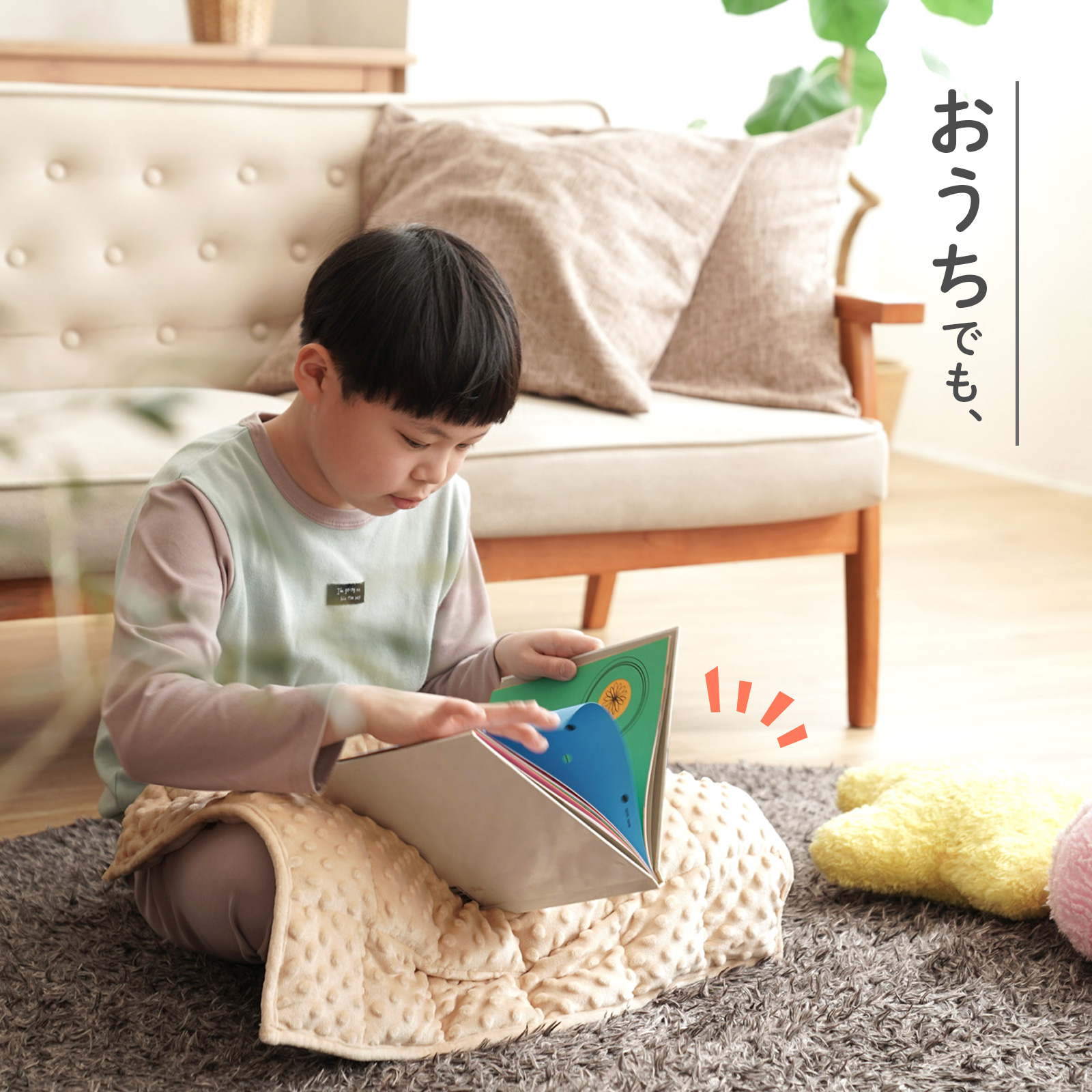 学習時間はもちろん、おうち時間やリラックスタイム、病院の待ち時間や映画館、移動中など、さまざまなシーンでご使用いただけます。子どもだけでなく大人の方にもお使いいただけ、オフィスや在宅ワークなど、落ち着いて過ごしたい時間にも取り入れやすく、どんな方の毎日にもそっと馴染むひざ掛けです。