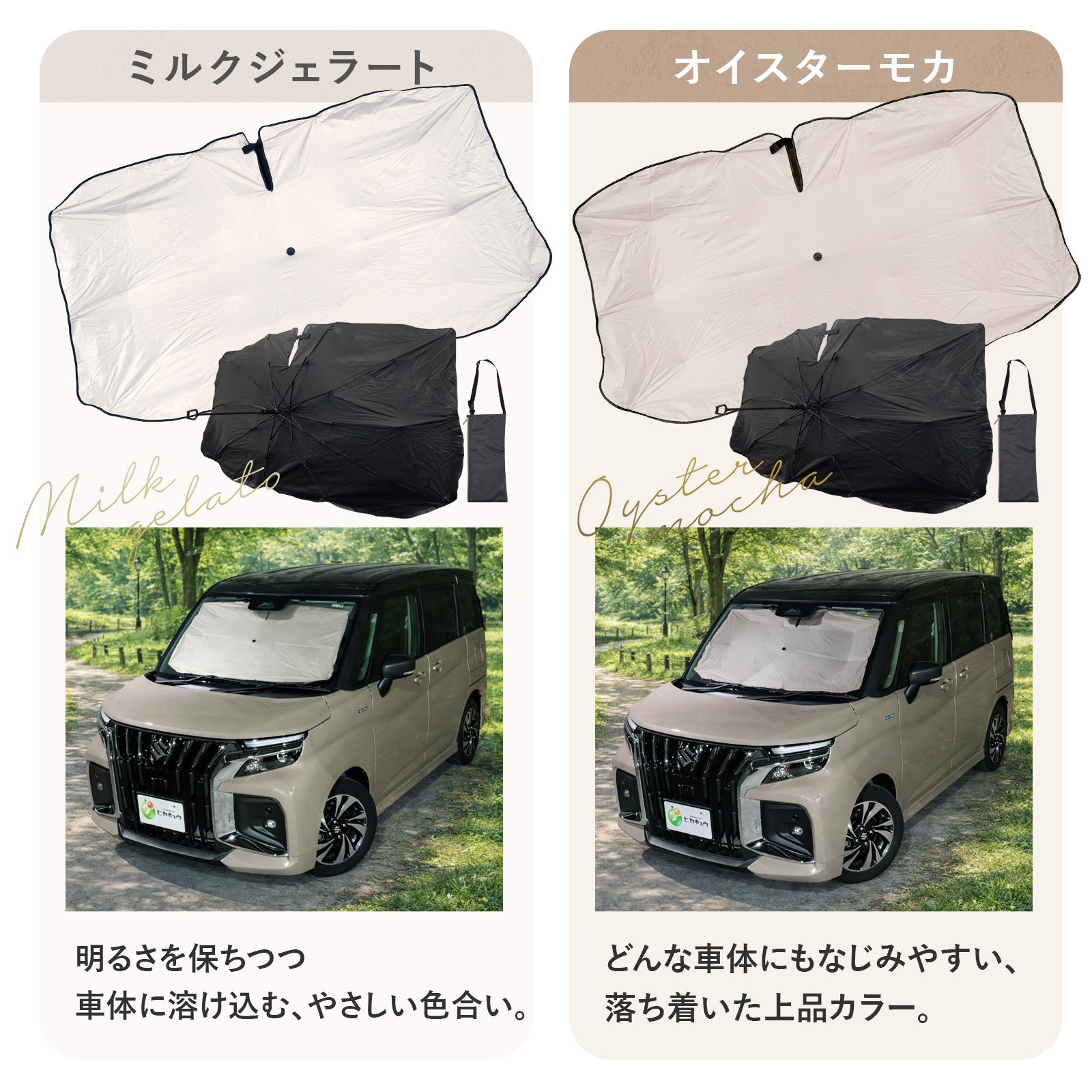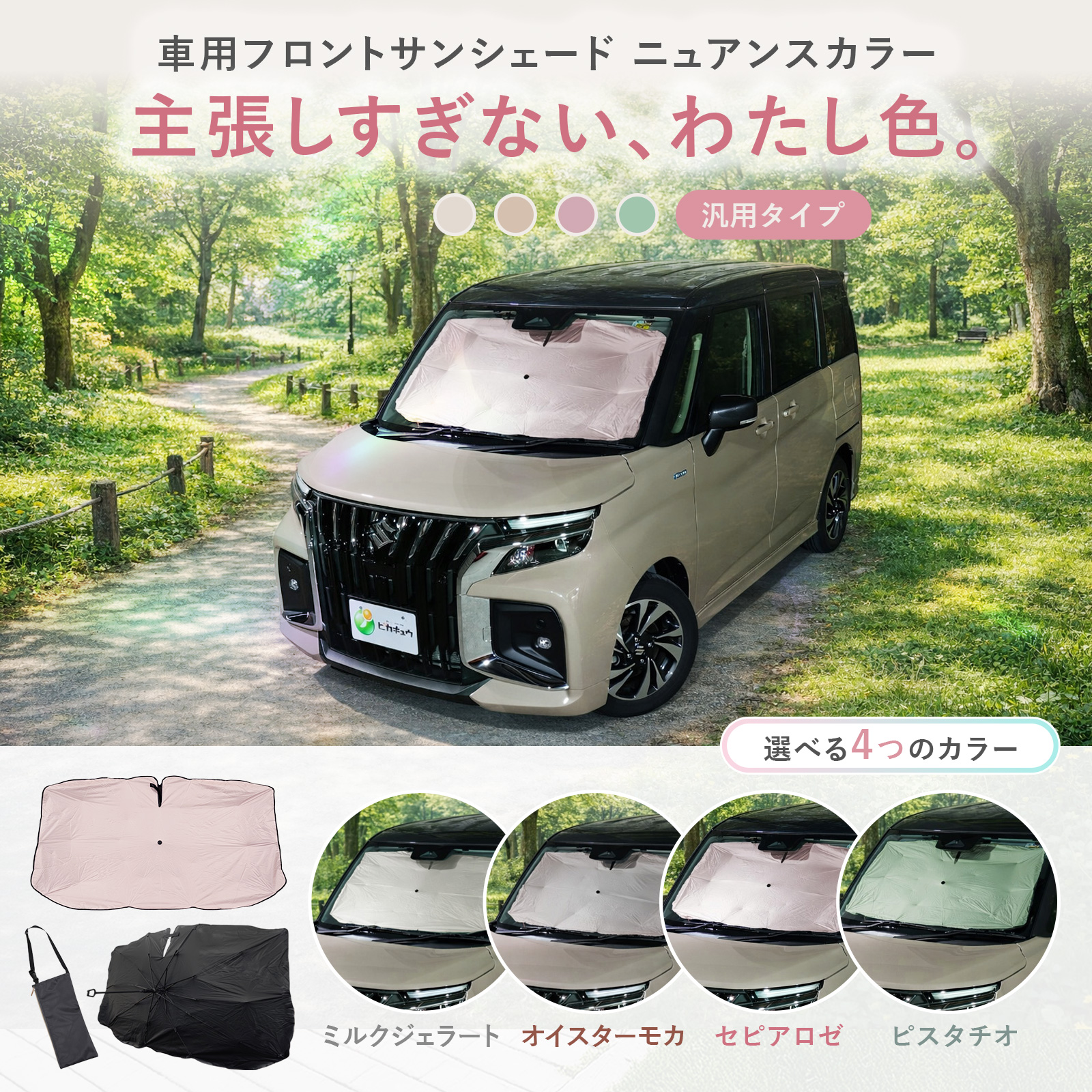 サンシェード選び、お困りではないですか?「シルバーやキャラ物だど、生活感が・・・」「お気に入りの車を邪魔しないカラーがほしい。」「汎用タイプだと、サイズが合うか不安」「使い終わった後、収納が面倒・・・」ピカキュウオリジナル「ニュアンスカラーサンシェード」なら全て解決します!