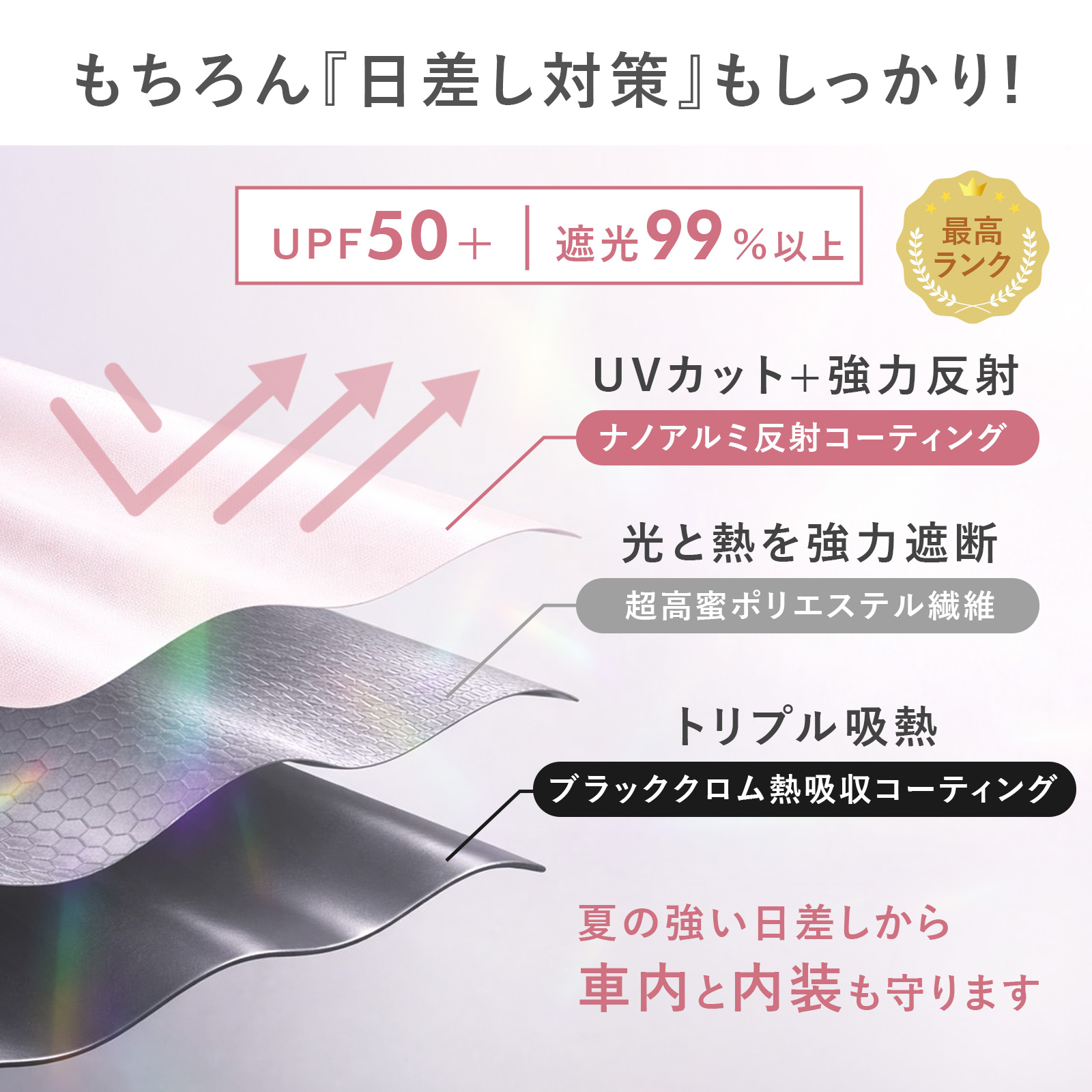 機能UVカット(UPF50+)、遮光(99%カット)、遮熱