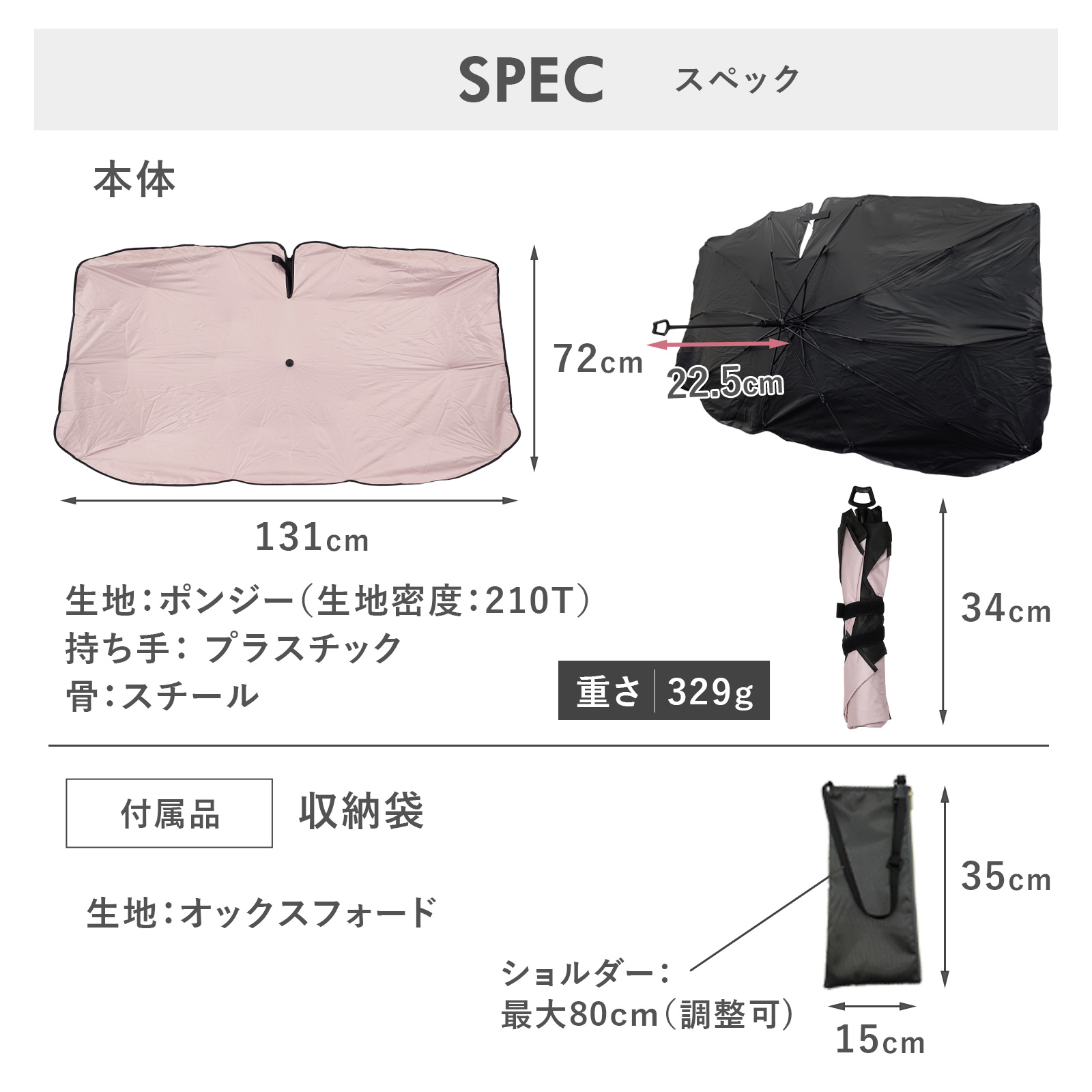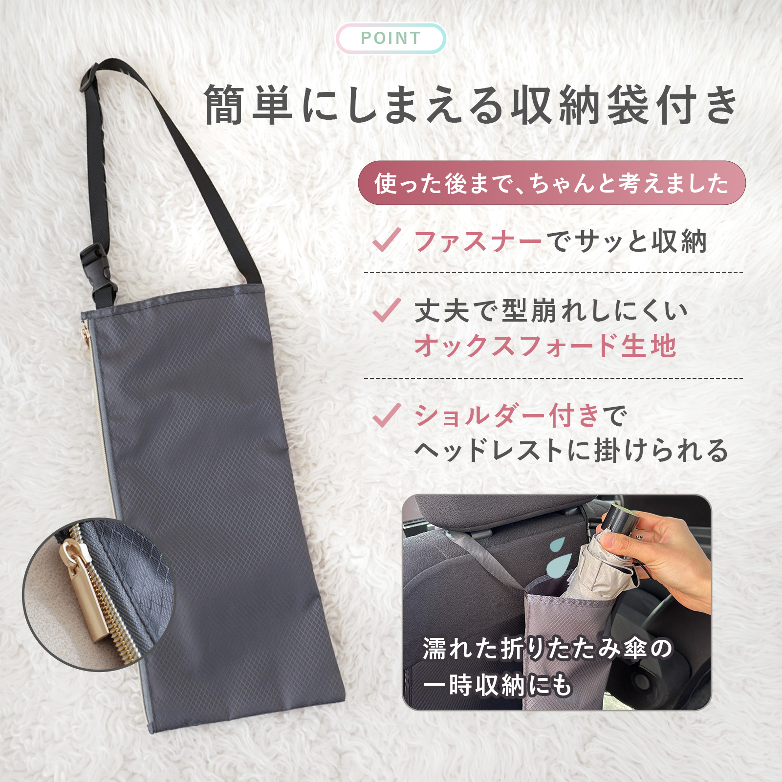 ●簡単にしまえる収納袋丈夫で型崩れしにくいオックスフォード生地を採用したオリジナル収納袋つき。ファスナータイプなのでサッと収納できます。最大80cmまで調整可能なショルダーベルト付きなのでヘッドレストにも掛けられます。