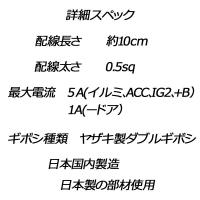 常時電源、ACC、イルミ、IG2,ドアアース(ルームランプに連動して点灯させることが可能です)の電源取り(通常デッキを外すか、ヒューズから電源をとります)がこれひとつで取り出せます。