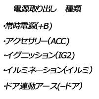 常時電源、ACC、イルミ、IG2,ドアアース(ルームランプに連動して点灯させることが可能です)の電源取り(通常デッキを外すか、ヒューズから電源をとります)がこれひとつで取り出せます。