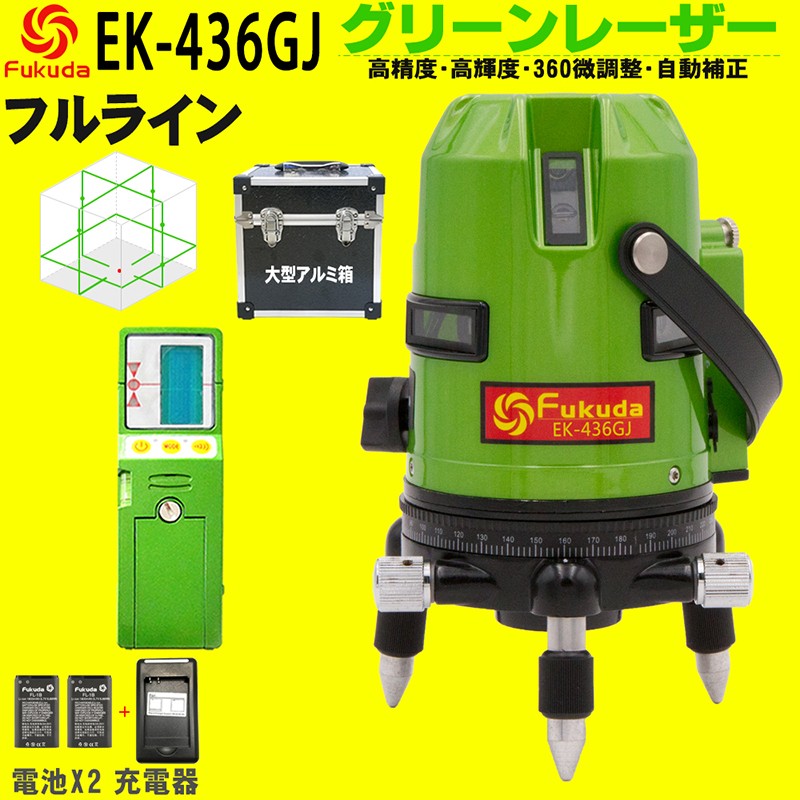 FUKUDA|フクダ フルライン グリーンレーザー墨出し器+受光器セット EK-436GJ リチウムイオンバッテリー*2本【1年間保証】縦×4 横全周 7ライン レーザーレベル
