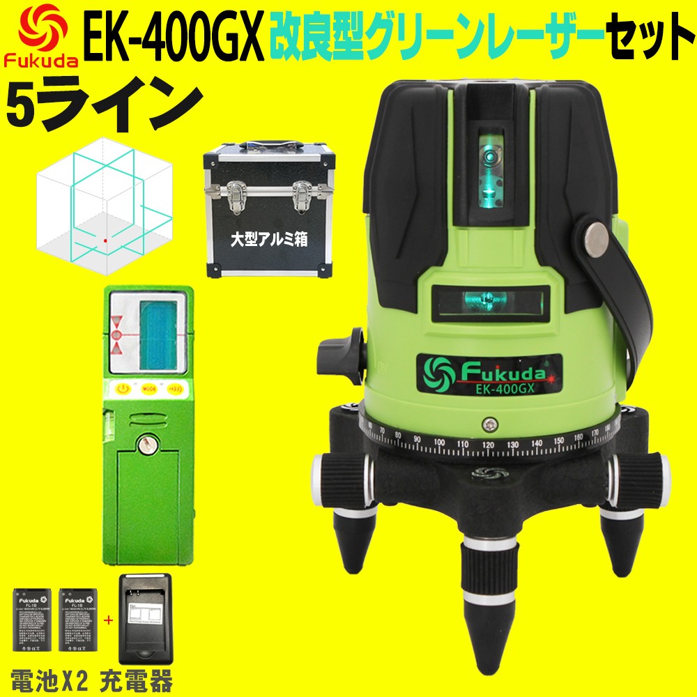 FUKUDA|フクダ 5ライン ダイレクトグリーンレーザー墨出し器+受光器セット EK-400GX【1年間保証】リチウムイオンバッテリー*2本 4方向大矩ライン 4垂直・1水平
