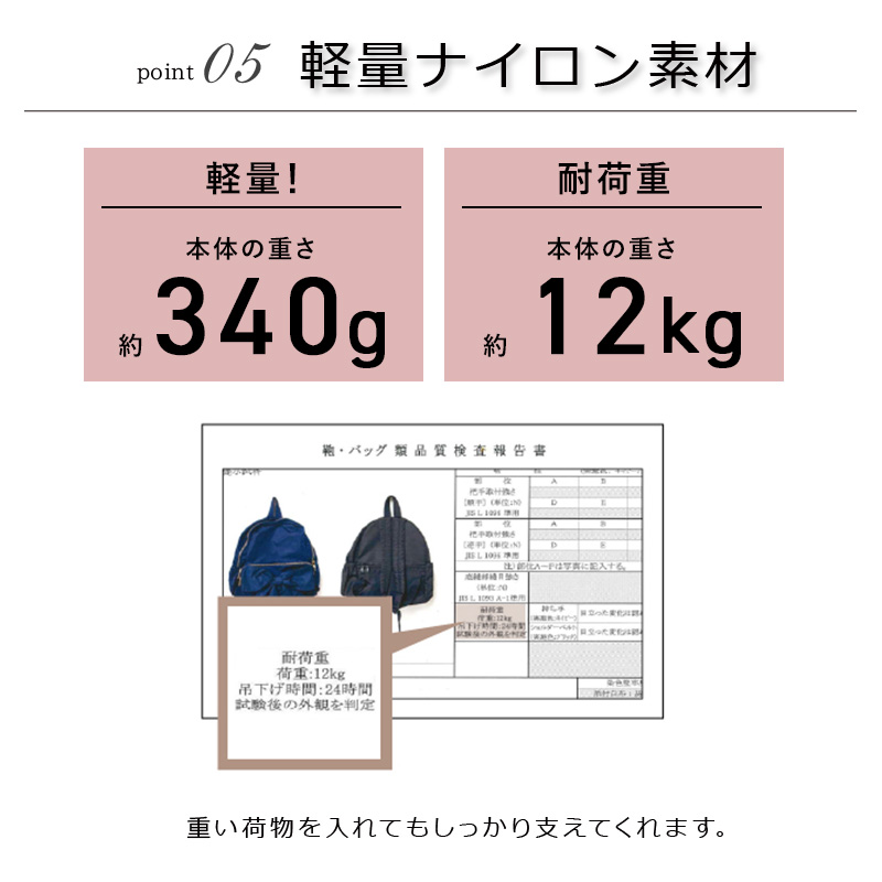 軽くて撥水性のあるナイロン素材なので雨の日も安心。