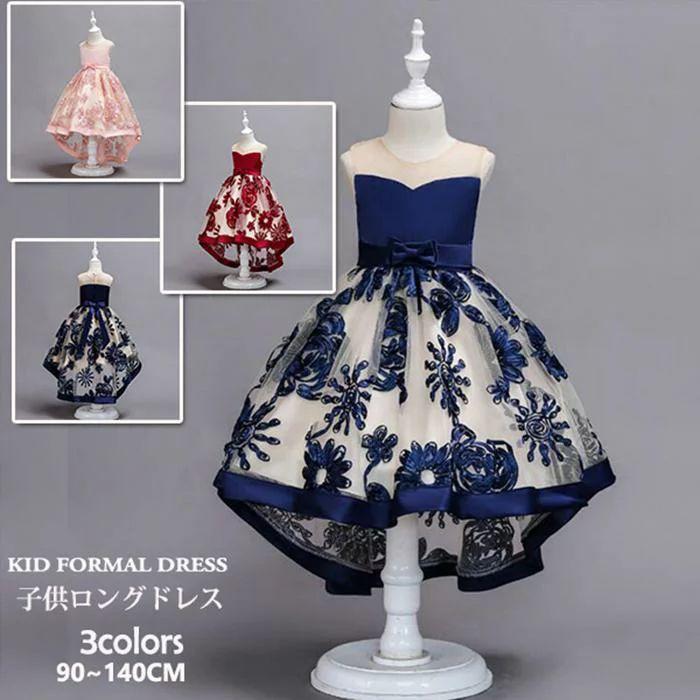 ネイビー 100cm刺繍柄 子供ドレス ドレス 子供 女の子 結婚式 発表会 チュールスカート ロングドレス ワンピース