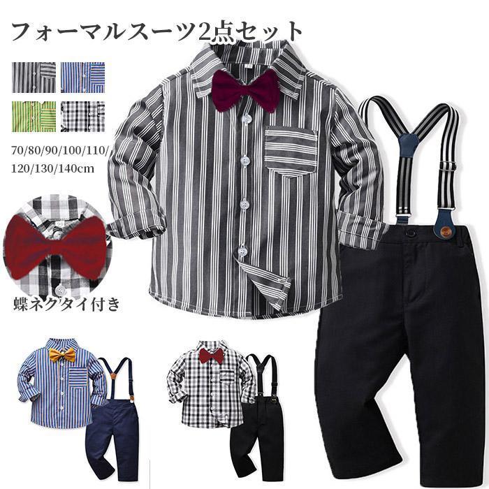 キッズ フォーマルスーツ 男の子 上下2点セットアップ 長袖シャツ+長ズボン サスペンダー付き 蝶ネクタイ付き ストライプ チェック柄 カッコイイ カジュアル 七五三 入園式 卒園式 入学式 パーティー 発表会