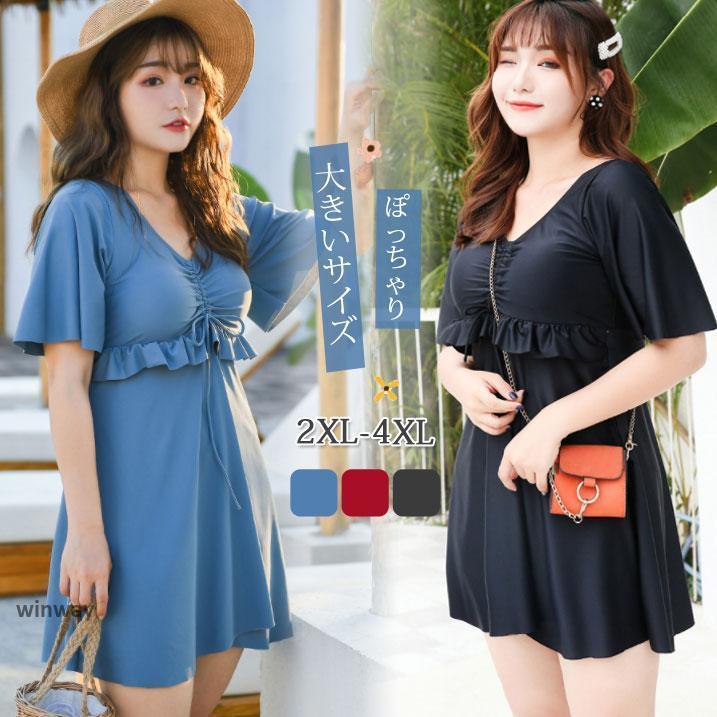 ぽっちゃり 水着 ワンピース 体型カバー 大きいサイズ レディース Vネック 半袖 露出控えめ オールインワン パッド付き ママ フレア
