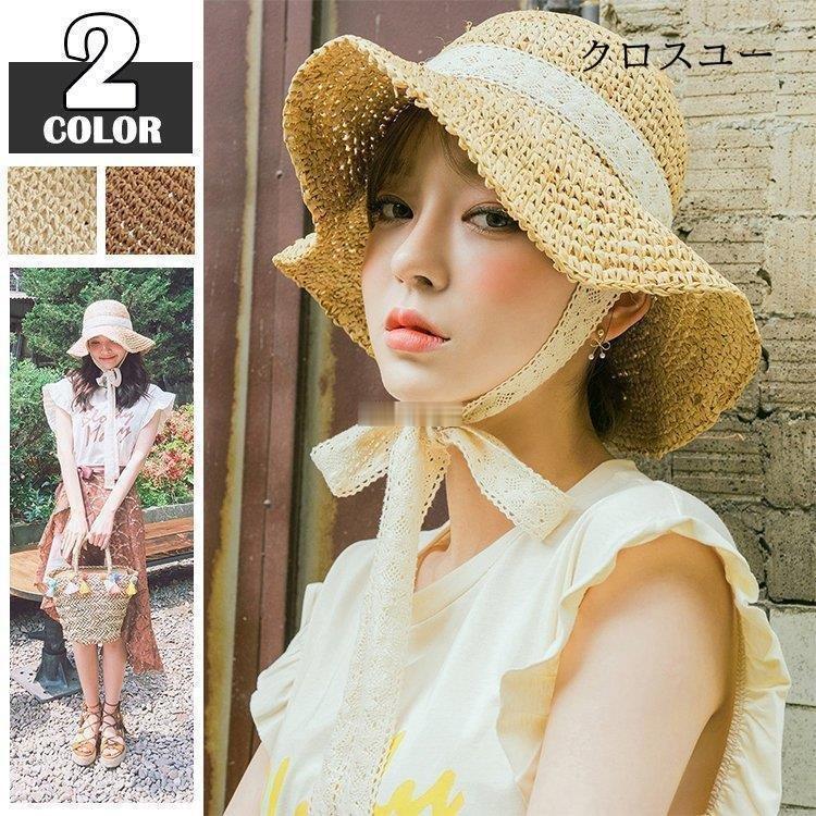 麦わら帽子 レディース uv 帽子 折り畳み 春夏 涼しい 大きめ ハット リボン レース つば広 おしゃれ 天然素材 2022