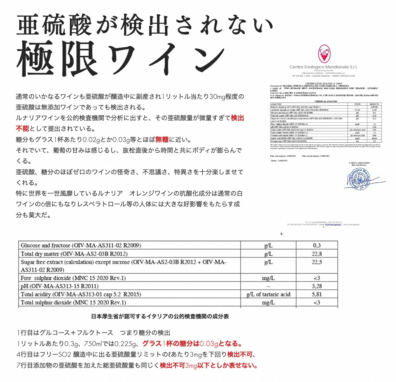 ルナリアワインを公的検査機関で分析に出すと、その亜碗酸量が微量すぎて検出不能として提出されている。