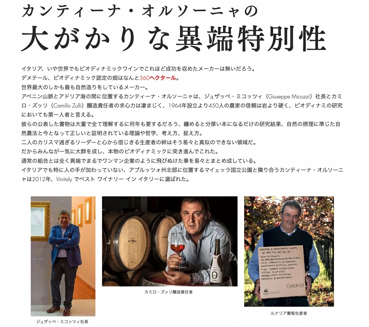 アペニン山脈とアドリア海の間に位置するカンティーナ・オルソーニャは、ジュザッペ・ミコッツィ(Giuseppe Micozz)社長とカミ口・ズッリ(Camillo Zull)醸造責任者の求心力は凄まじく、1964年設立より450人の農家の信頼は岩より硬く、ビオディナミの研究においても第一人者と言える。