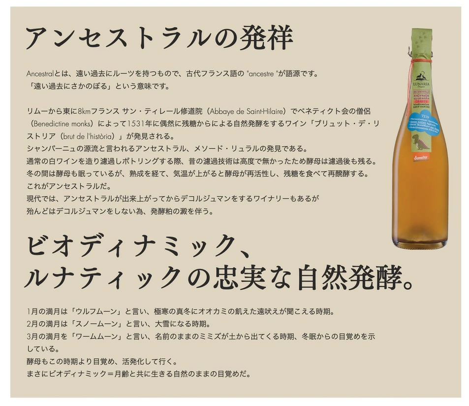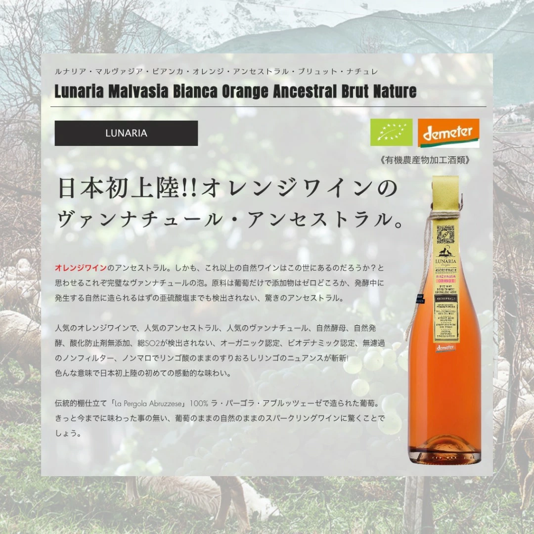 人気のオレンジワインで、人気のアンセストラル、人気のヴァンナチュール、自然酵母、自然発酵、酸化防止剤無添加、総SO2が検出されない、オーガニック認定、ビオデナミック認定、無濾過のノンフィルター、ノンマロでリンゴ酸のままのすりおろしリンゴのニュアンスが斬新!色んな意味で日本初上陵の初めての感動的な味わい。