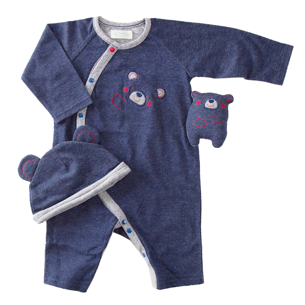 妖精の森 ベビー用 デニムくまちゃんギフト カバーオール 帽子 にぎにぎ 3点セット YGS001