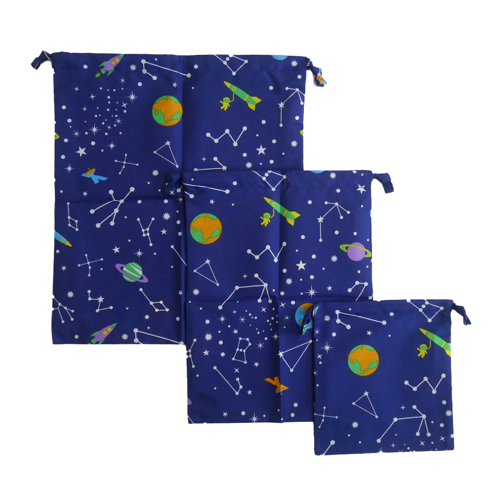 撥水性のあるポリエステルで縫製された、サイズの異なる巾着袋3点セットです。