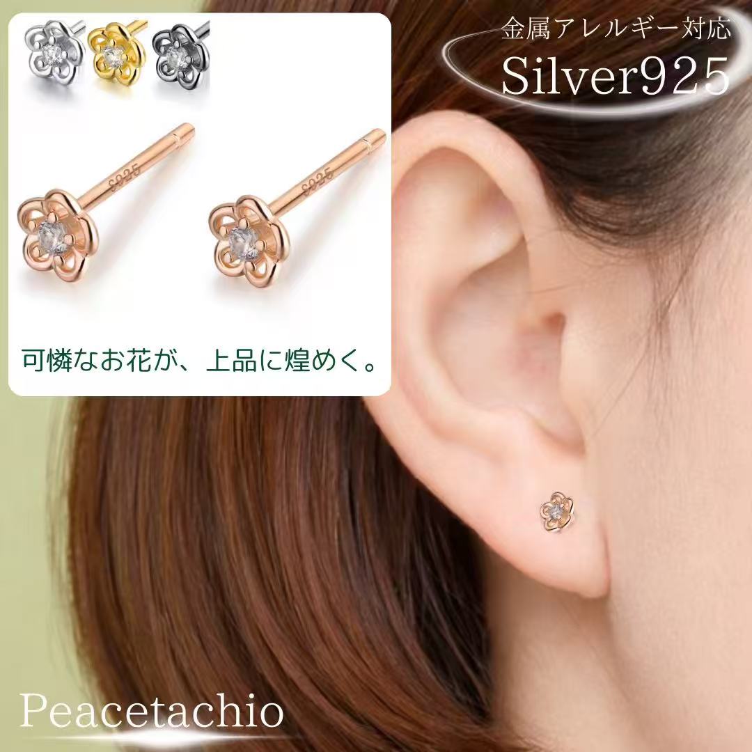 【大人気商品】ピアス レディース アクセサリー シルバー Silver925 18Kコーティング 金属アレルギー対応 フラワー ブラック CZダイヤ 小ぶり 小さい ミニ