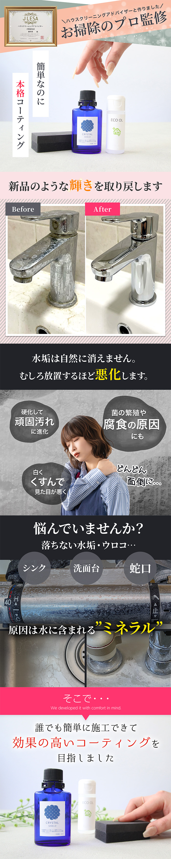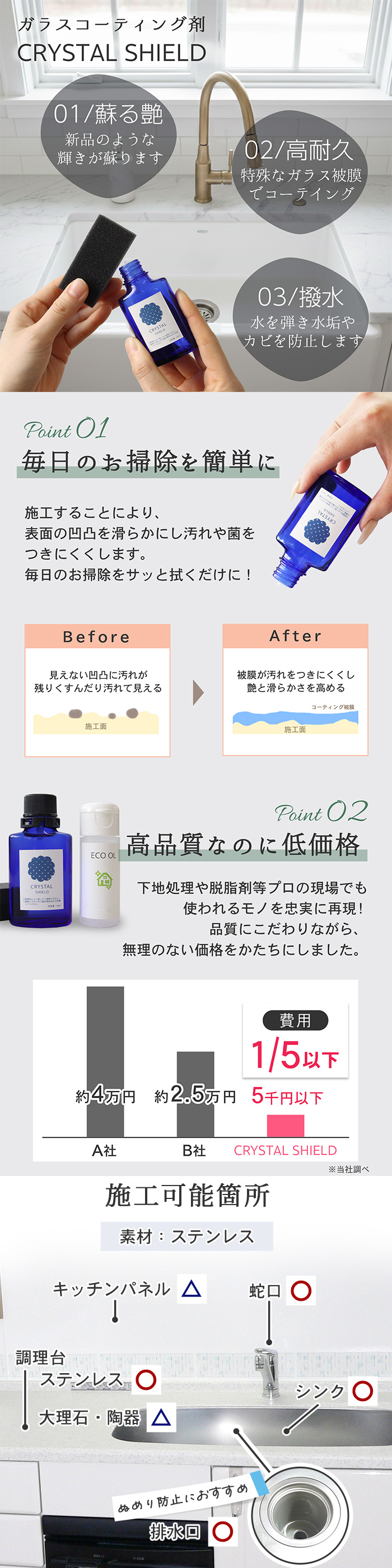 撥水・防汚・ツヤ出しの3効果!シンクや洗面台に塗るだけで、水垢や汚れを強力ガード。時短&清潔をキープ♪