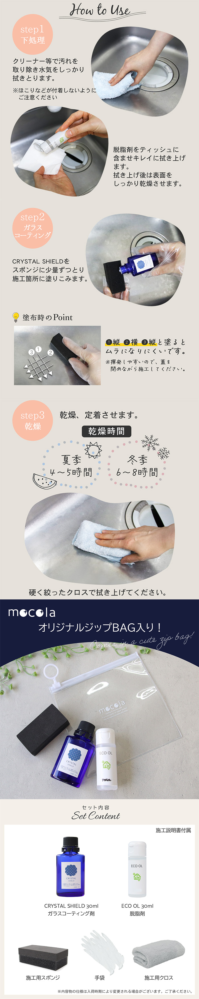 【引っ越し・退去前の大掃除に】ガラスコーティング キッチン用フルセット 日本製 3年耐久 撥水 施工スポンジ クロス 脱脂剤付き シンク 洗面台 保護