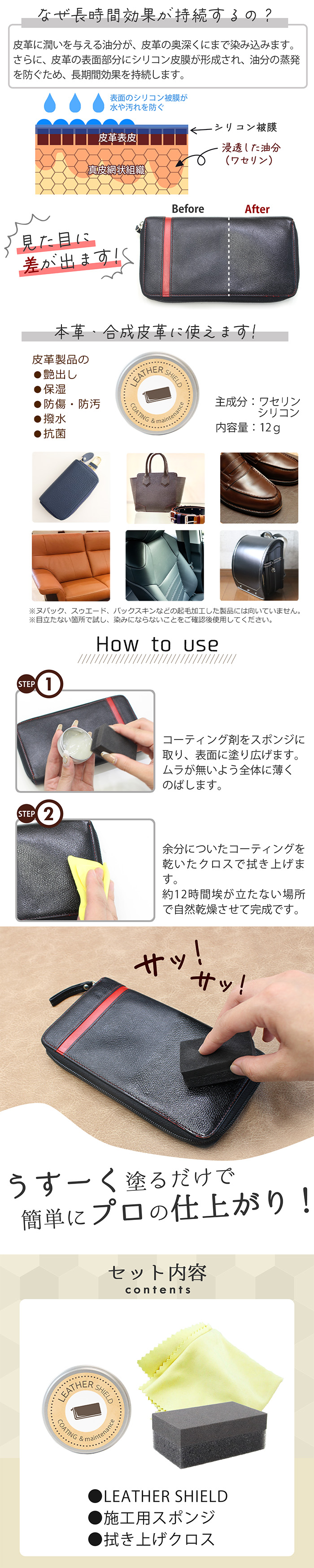 レザーコーティング 革保護 撥水 防水 防汚 ひび割れ防止 艶出し 本革 財布 バッグ 革靴 ソファ 車 シリコン配合 日本製 12g