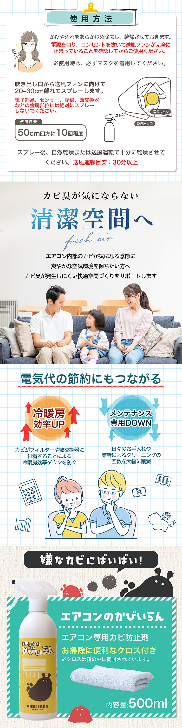 日本製 送風カビ予防 暖房対応 分解不要 簡単施工 赤ちゃん安心 家族向け 消臭 抗菌対策 エアコンメンテナンス 内部コーティング 梅雨対策 冷房前対策 クリーニング後仕上げ 予防型防カビ