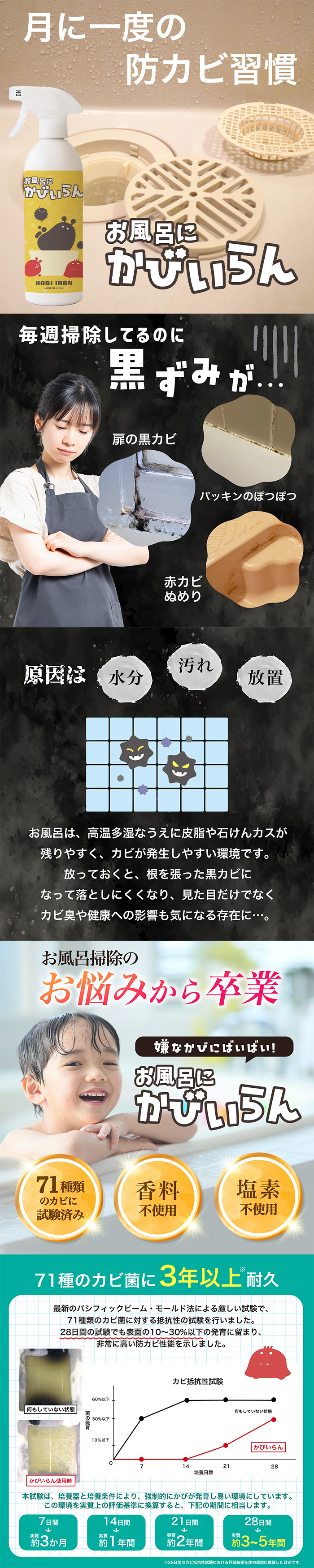 本製品は、お風呂カビ防止や浴室カビ予防を目的とした防カビスプレーです。浴室の天井やゴムパッキン、タイル目地、壁や排水口に発生する黒カビや赤カビの再発を防ぎます。塩素不使用・無香料設計で、子どもやペットがいる家庭でも使いやすい処方です。