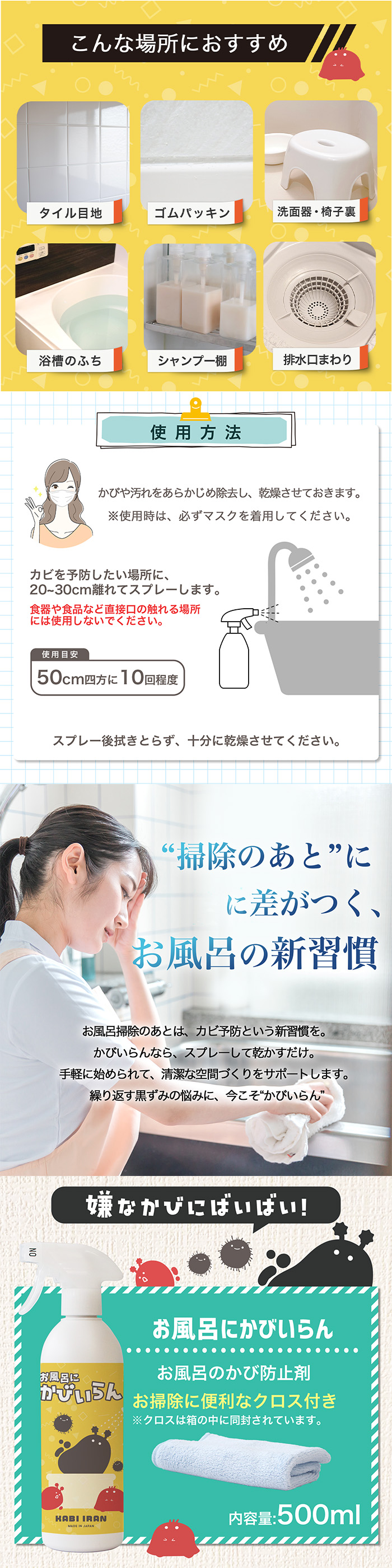 お風呂カビ防止 スプレー 500ml 浴室カビ予防 長持ち設計 天井 ゴムパッキン 黒カビ 赤カビ 無香料 塩素不使用 子供安心 日本製 防カビ剤