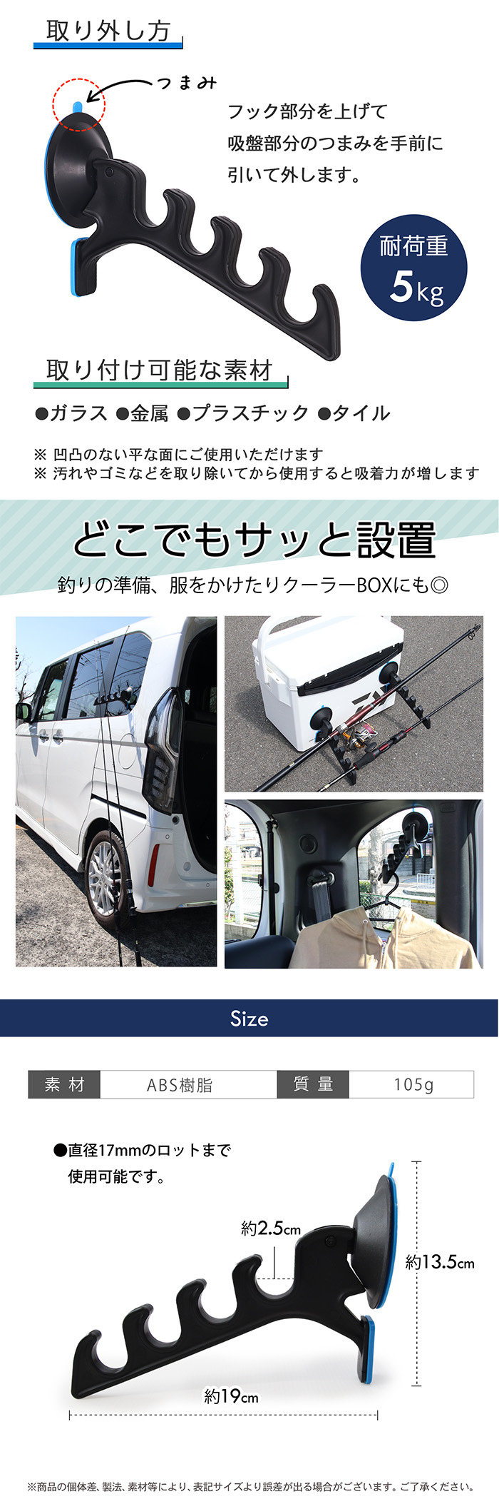 吸着力の高い直径8cm吸盤で、釣り竿・タオル・ウェアなど多用途対応。