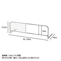 構造部材:金属(鋼) 表面加工:エポキシ樹脂塗装/めっき(クロム) | 全体:幅950〜1200 × 奥行400 × 高さ355mm 折りたたみサイズ:930x25x355mm 鉄厚:0.7mm |