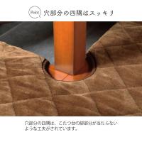 掘りごたつ対応で、くり抜きたれ下げタイプのカーペットです。日本では古くから親しまれてきた掘りごたつ。その特殊な形状から、敷物が敷けないのが難点。そんなお悩みを解決してくれる商品です。表地はあったかボアで滑らかな肌触りです。くり抜き部分は垂れ下げタイプのため、掘りごたつの木材が足に直接あたらないので、ひざ裏部分の冷えも防止できます。また、長時間座っていても足が疲れません。穴部分の四隅は、こたつ台の脚部分が当たらないような一工夫がされています。