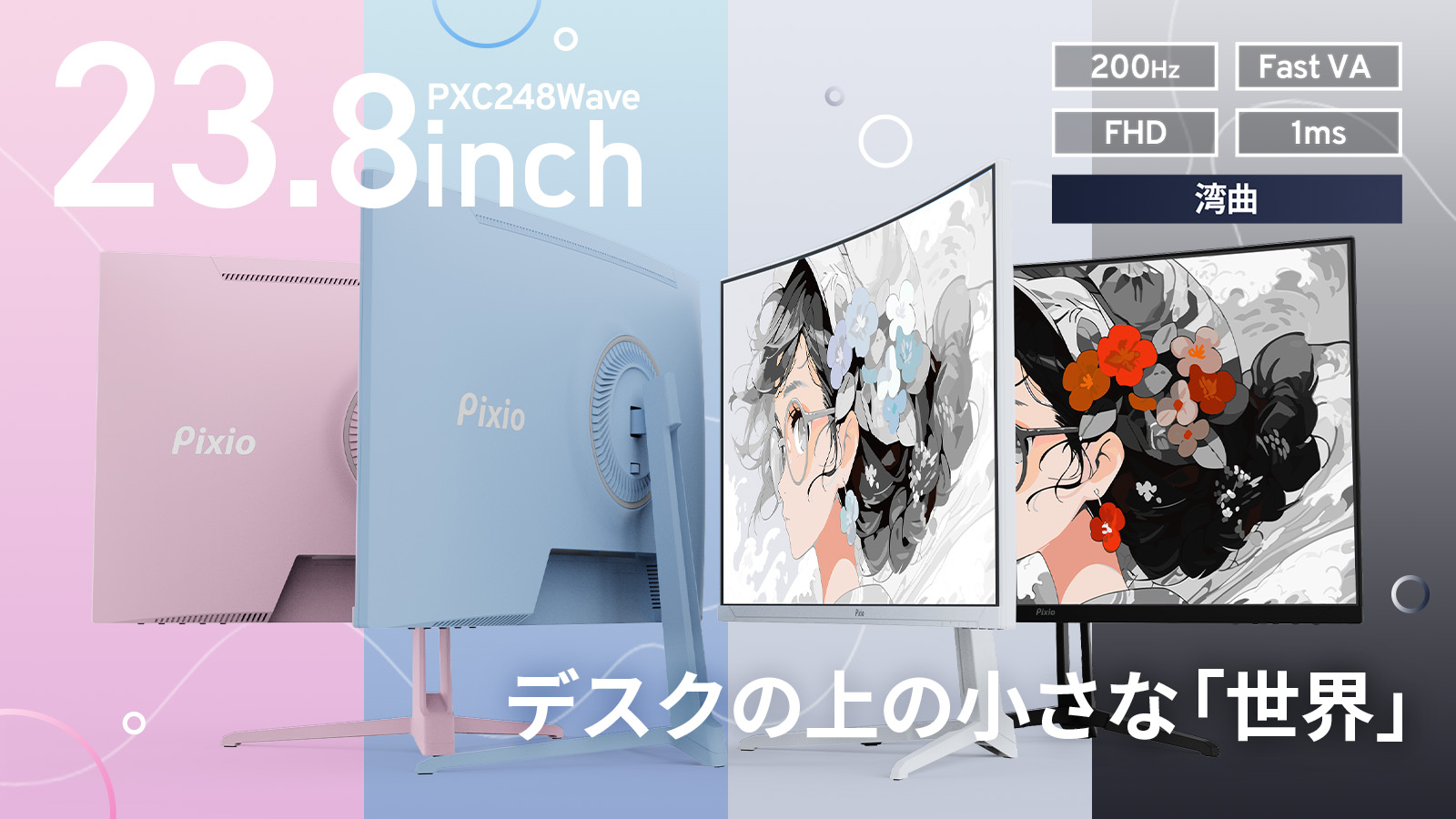 | pxc248waveは、ホワイトやパステルカラーなどカラーラインナップを取りそろえ、理想のゲーム部屋のコーディネートができるゲーミングモニターです。鮮やかなVAパネルの湾曲モニターに、200Hzの超高リフレッシュレートを備えた、没入感のあるゲーミングモニターです。 |