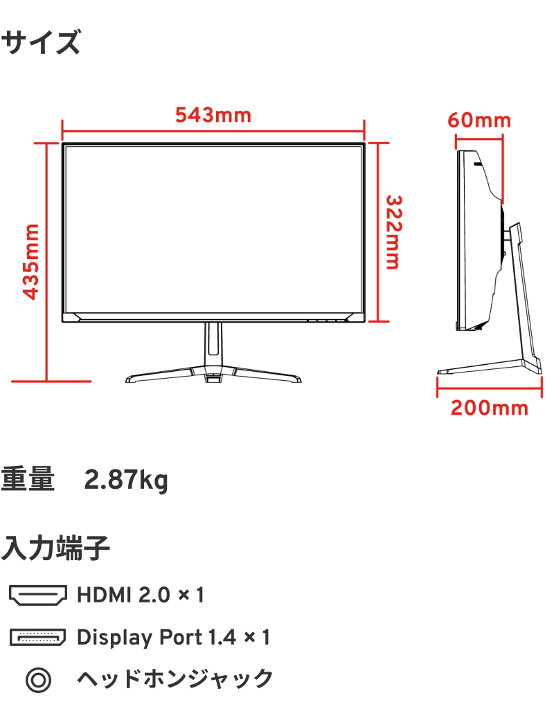 | 入出力端子 | DP1.4 x 1, HDMI2.0 x 1, イヤホンジャック x 1 | |