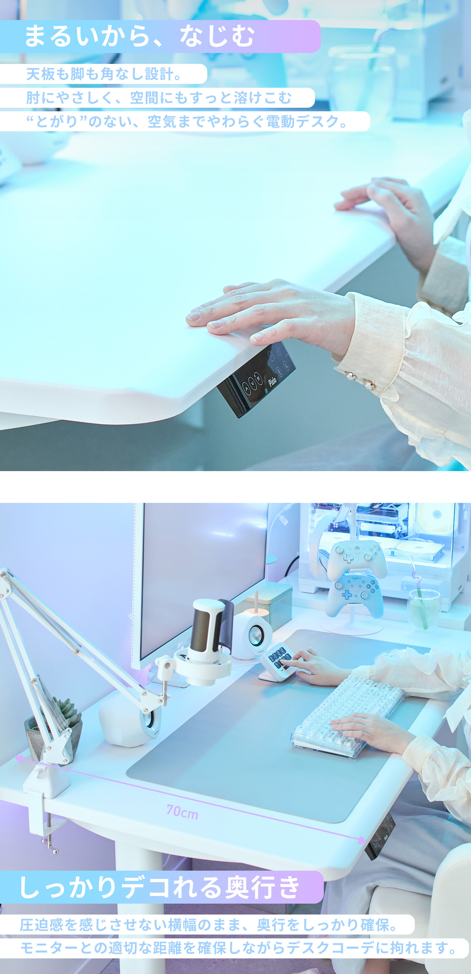 なめらかな曲線で仕上げた天板と脚は、柔らかな印象を与えつつ空間に自然に溶け込み、コンパクトなサイズ感ながらも奥行はしっかりと確保。モニターや周辺機器をゆったり配置でき、長時間のプレイや作業でも快適な環境を実現します。