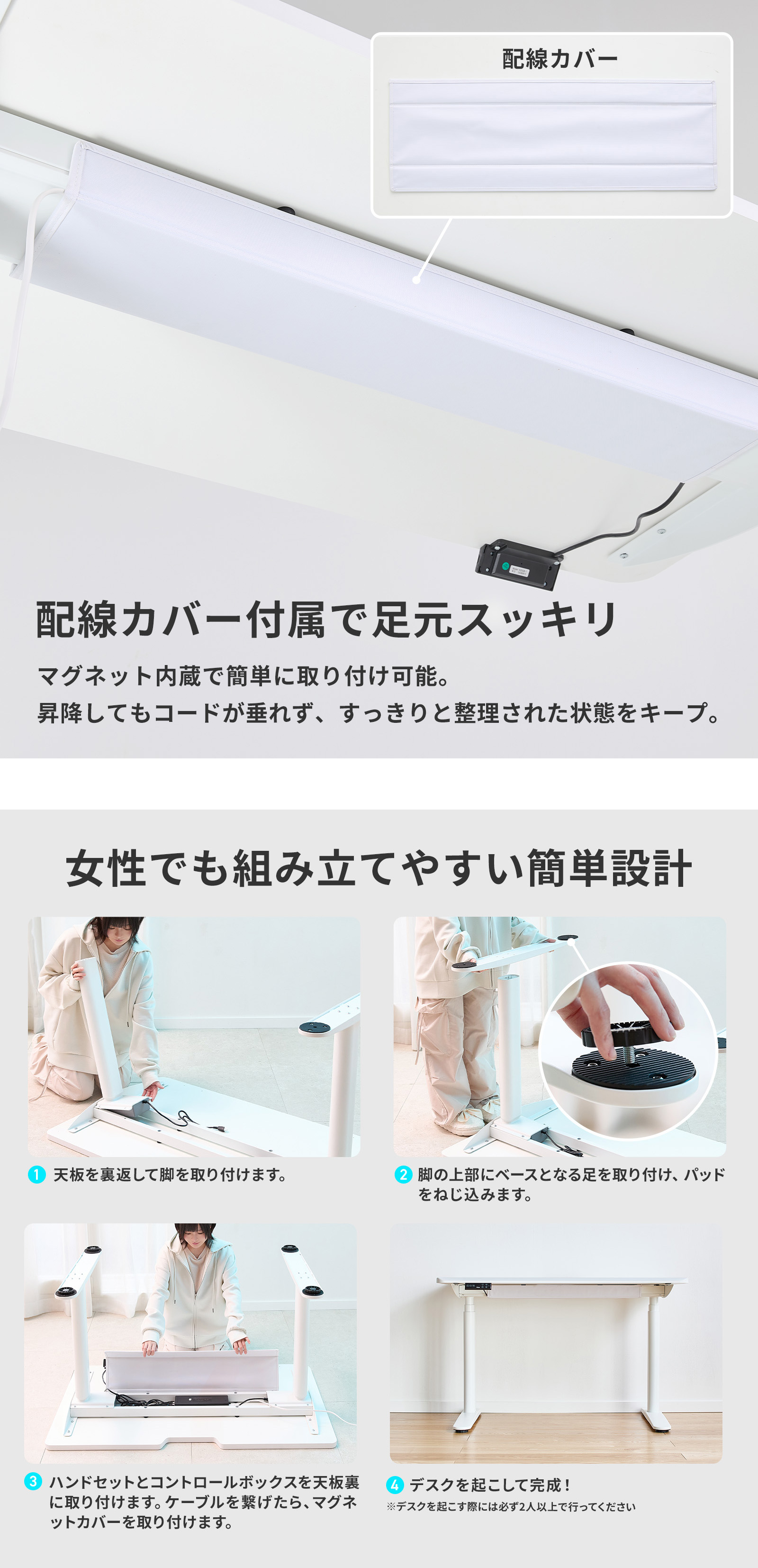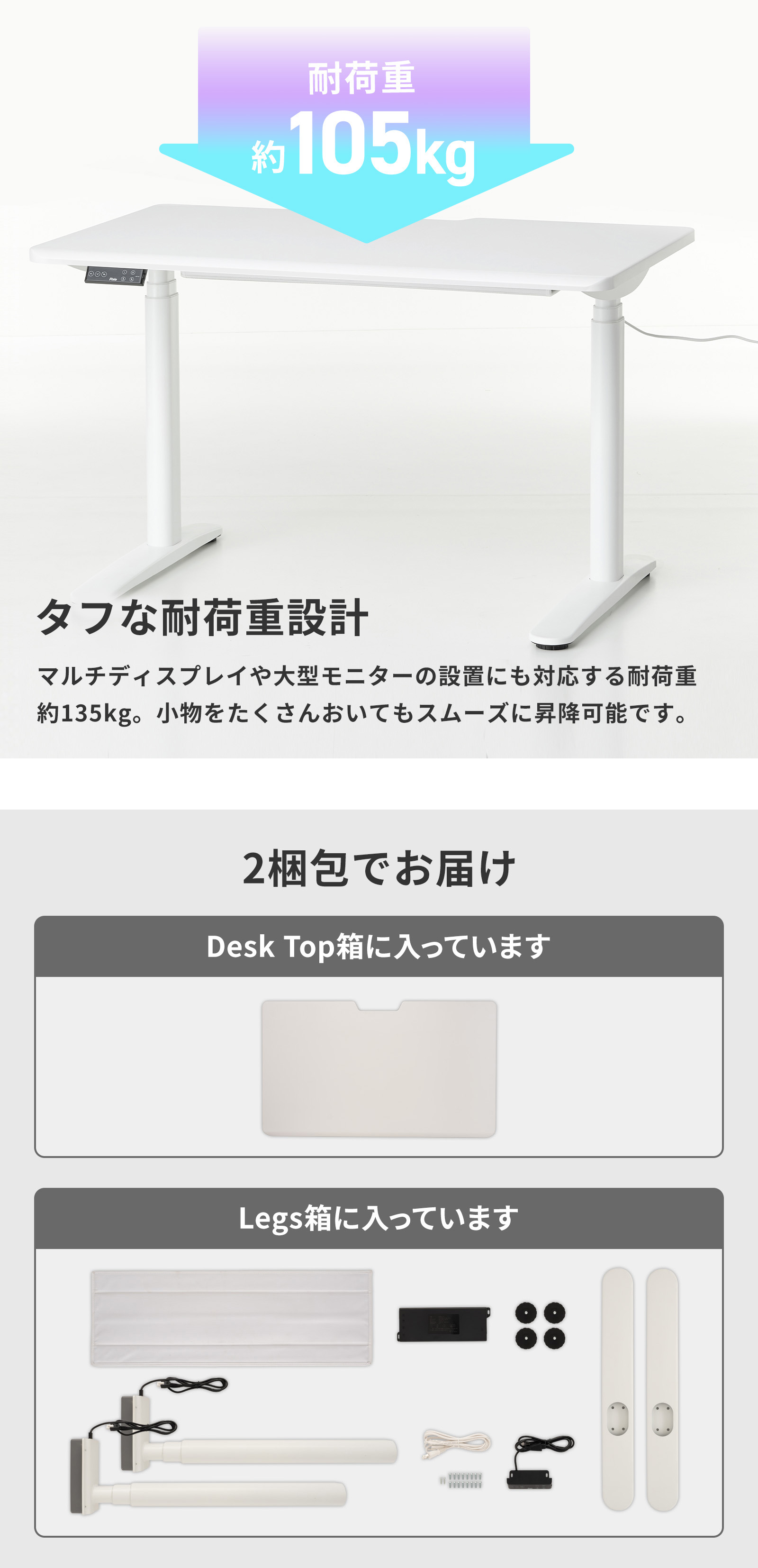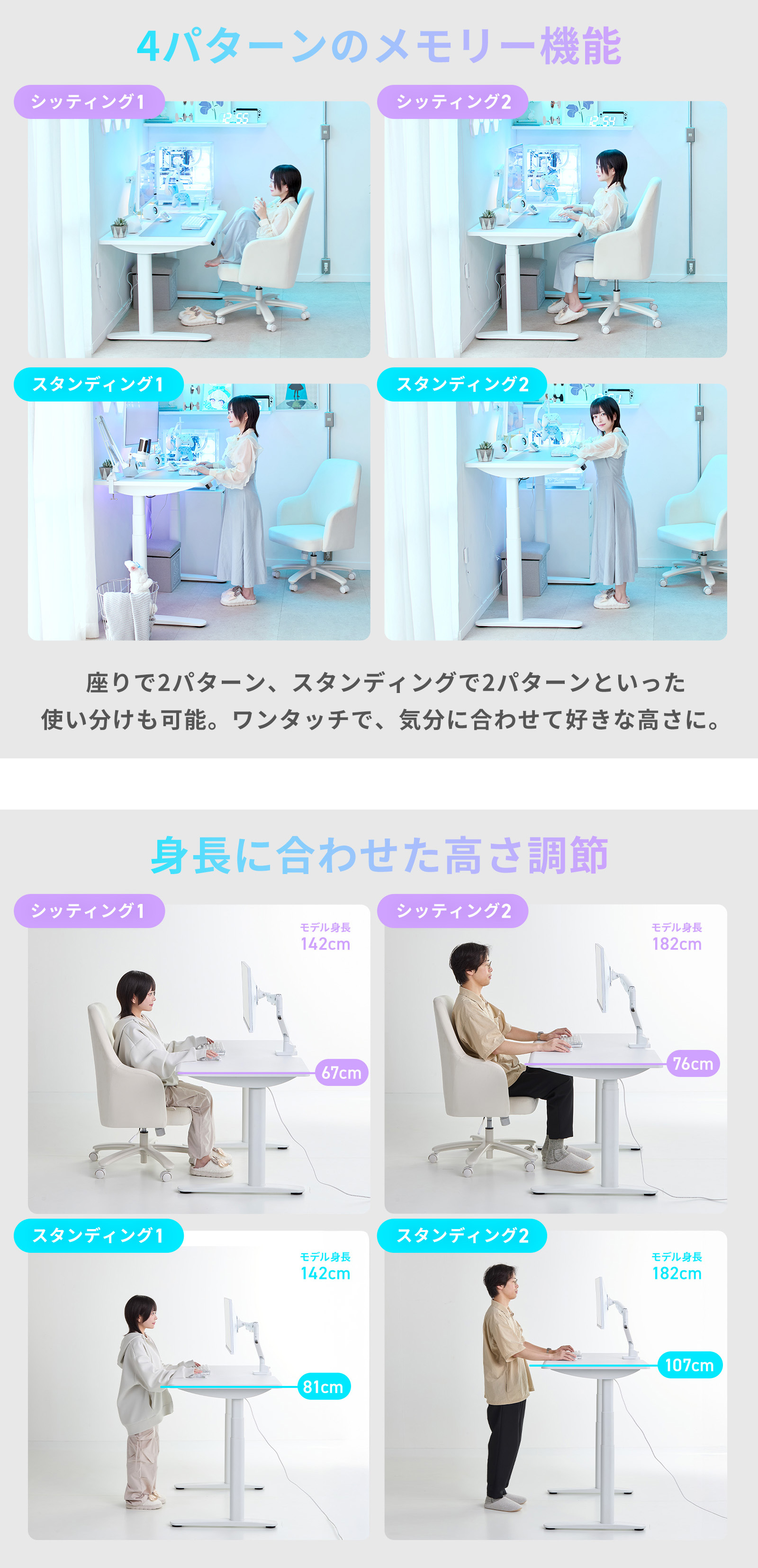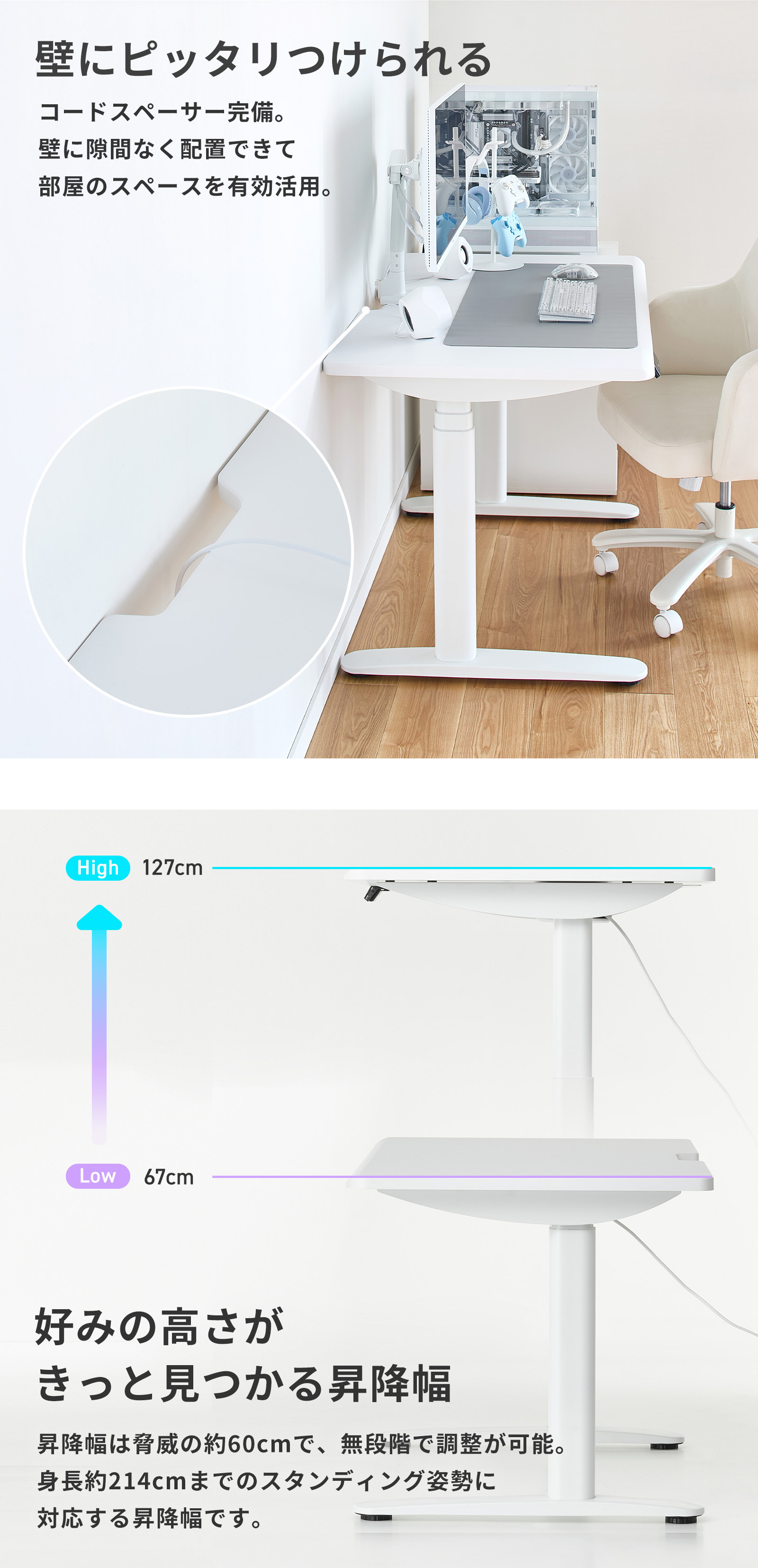 高さは最大60cmの昇降幅で、座り作業から立ち作業まで自由自在。4つまで記録できるメモリ機能と誤操作を防ぐロック機能を備え、日々のスタイルに合わせてワンタッチで理想の高さを再現できます。