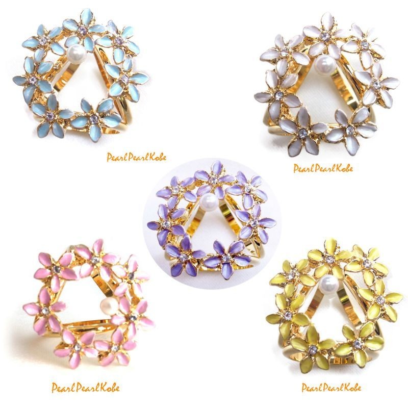 スカーフリング 花 本真珠 スワロフスキー ショール エレガント 3リング 黄色 紫 白 水色 ピンク