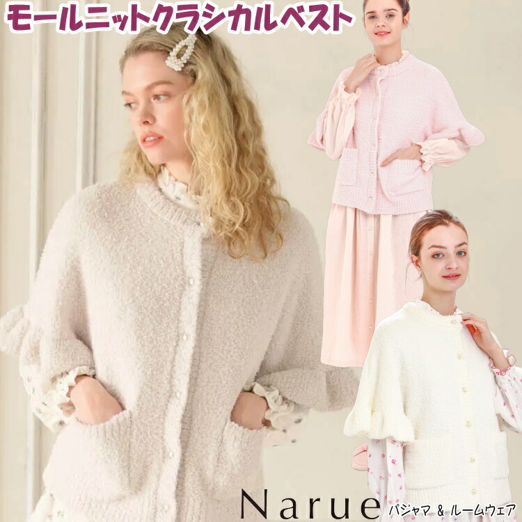 モールニット クラシカル ベスト ルームウェア ベージュ ホワイト ピンクチョッキ 羽織物 narue Moon Tan 暖か あったか レディース 前開き 半袖 フリル 秋冬 冬