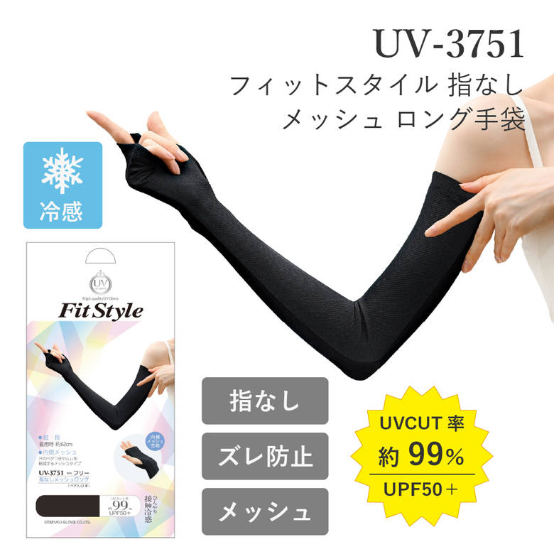 アームカバー uvカット 99% ロング 接触冷感 UPF50+ 黒 指なし メッシュ 日焼け対策 自転車 おしゃれ 手 腕 手の甲 テニス ゴルフ ドライブ スポーツ おたふく手袋 フィットスタイル UV-3751