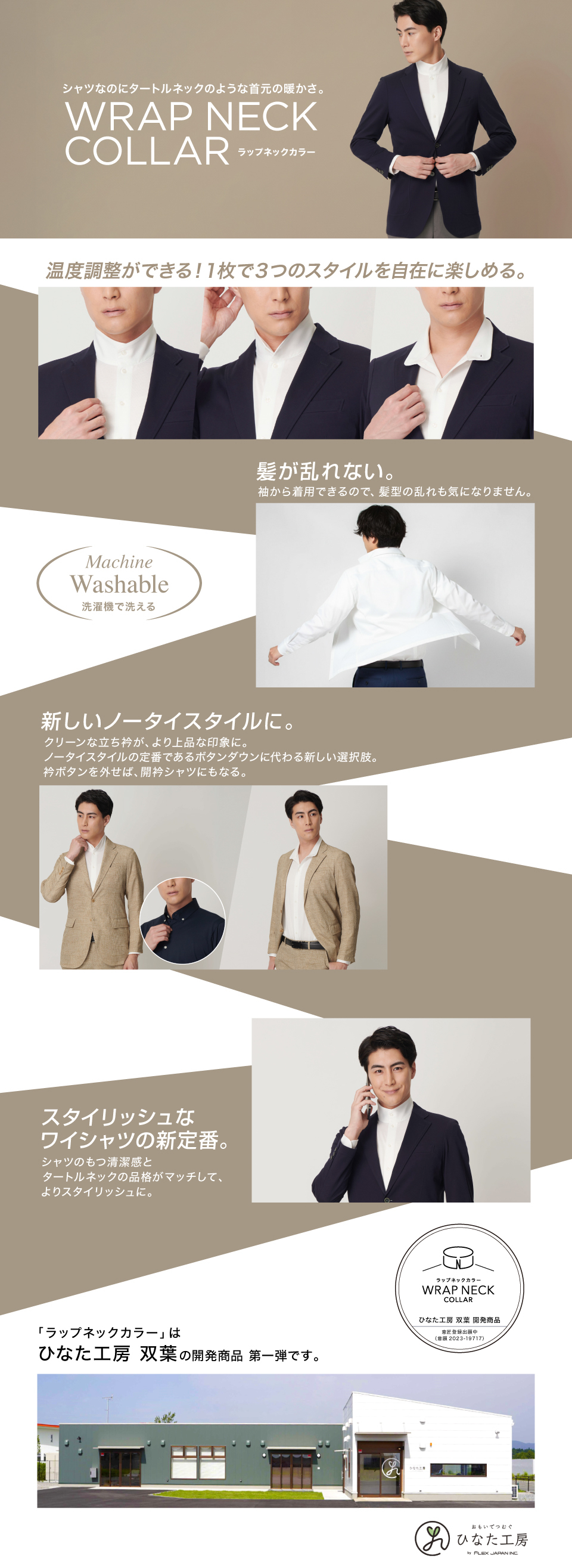 ワイシャツに新開発の首(Neck)を覆う(Wrap)高い衿(Collar)「ラップネックカラー」を採用。