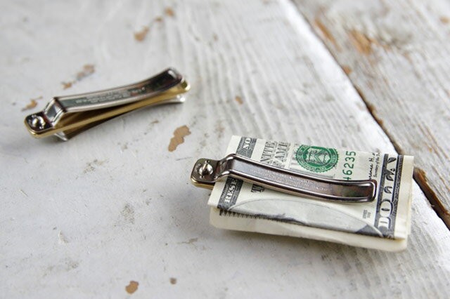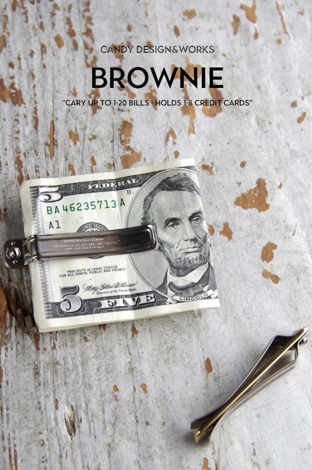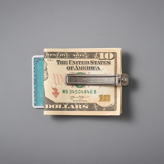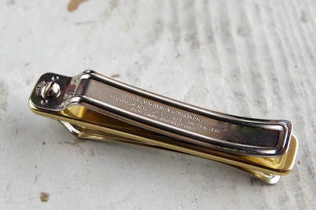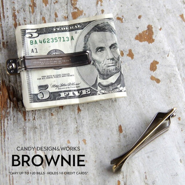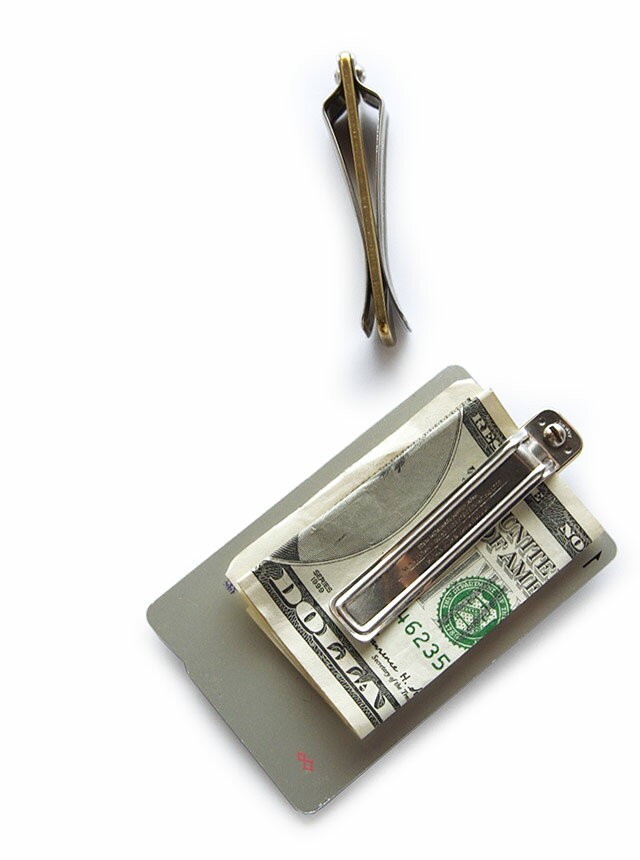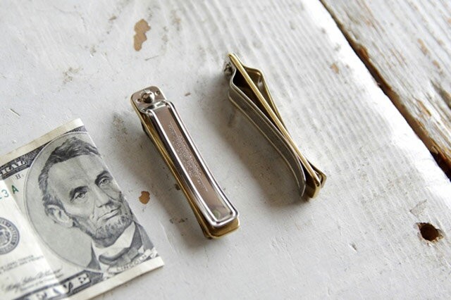 厚みのあるブラスのプレートを中央に配し、そのサイドにニッケルのクリップが付いたデザイン。収納部分が二ヵ所に分かれているので、紙幣の種類によって収納場所を分けたり、カードと紙幣で分けたり、といった使い方が出来ます。