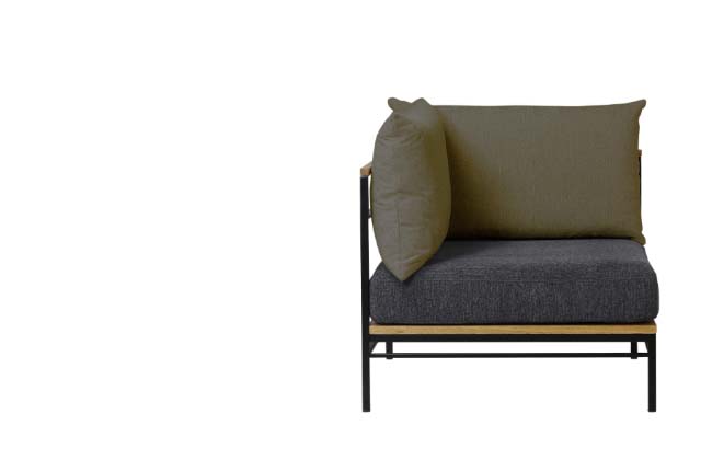 スリムなアイアン(スチール)フレームに木のパーツを組み合わせ、手すりのようなデザインに仕上げたモジュールソファ。スタイリッシュで抜け感のあるデザインが、お部屋を広く見せながらもあたたかみを添えます。