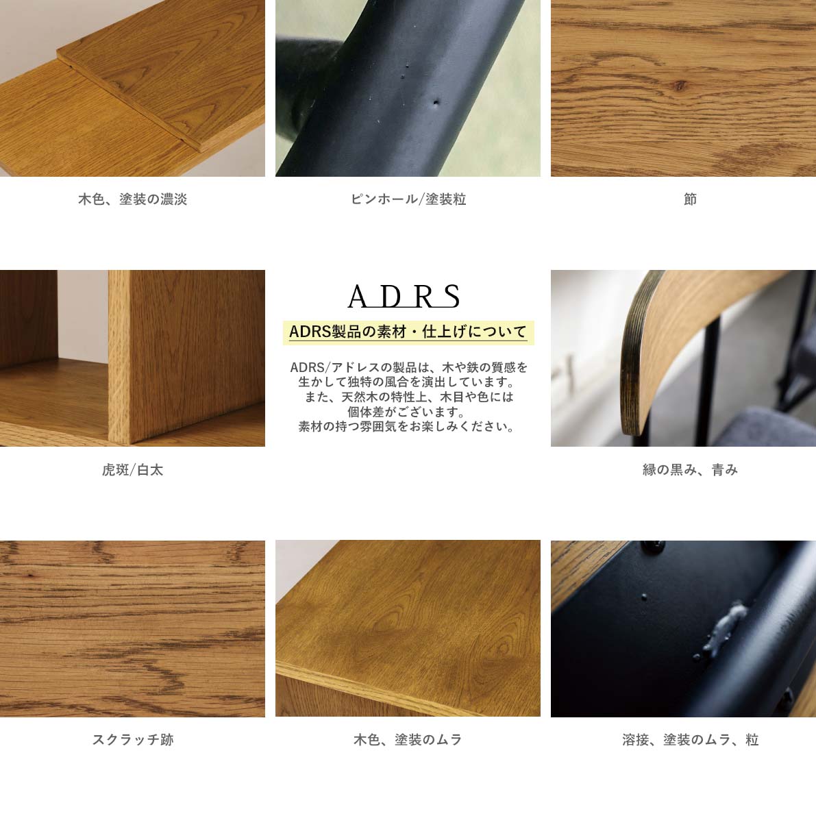 ADRS/アドレスの製品は、木や鉄の質感を生かして独特の風合を演出しています。
