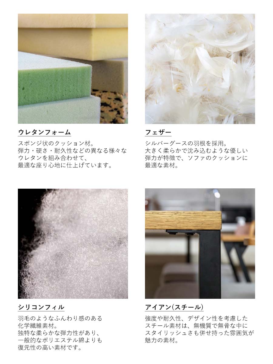 | 材質 | ファブリック:ポリエステル100% クッション材:フェザー、シリコンフィル ウレタンフォーム フレーム:オーク無垢材(ラッカー塗装)、スチール(粉体塗装) |