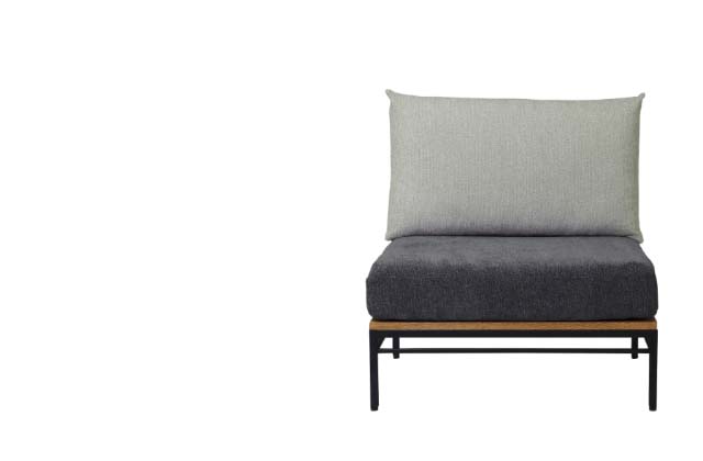 スリムなアイアン(スチール)フレームに木のパーツを組み合わせ、手すりのようなデザインに仕上げたモジュールソファ。スタイリッシュで抜け感のあるデザインが、お部屋を広く見せながらもあたたかみを添えます。