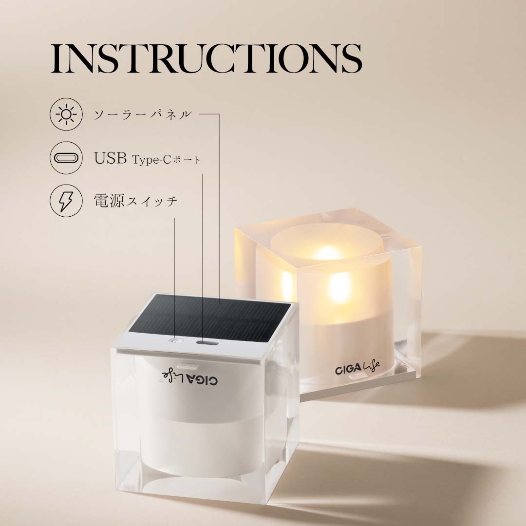 ベッドサイドやリビングはもちろん、アウトドアや防災用としても活躍。底面にはソーラーパネルとUSB Type-Cポート、ON / OFFスイッチを備え、シンプルで洗練されたデザインも魅力です。