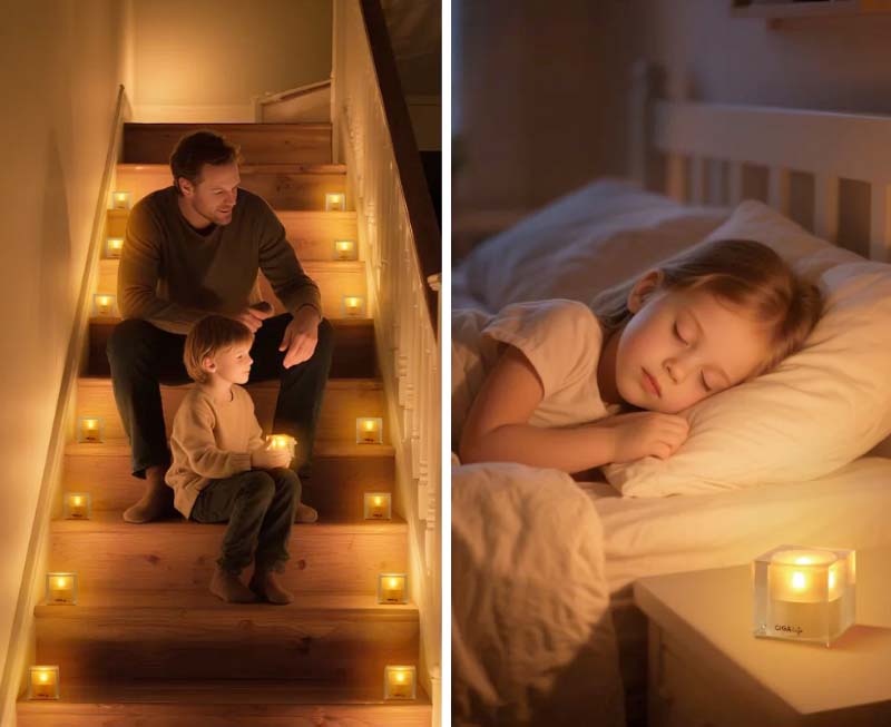 ノックで反応するタッチセンサーや、息を吹きかけて操作するブレススイッチを搭載。ロウソクを消すように息を吹きかけて消灯する仕草は、デジタルでありながらアナログな温かみを感じさせます。