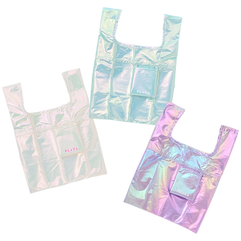 PLAZA・MINiPLA限定アイテム!小さく畳めてコンパクトになる、ちょっとしたお買い物に便利なエコバッグです。500mlのペットボトルが横向きに入るサイズで、畳むととてもコンパクトになります。サブバッグとしてすぐ使えるように、丸カラビナ付きになっています。