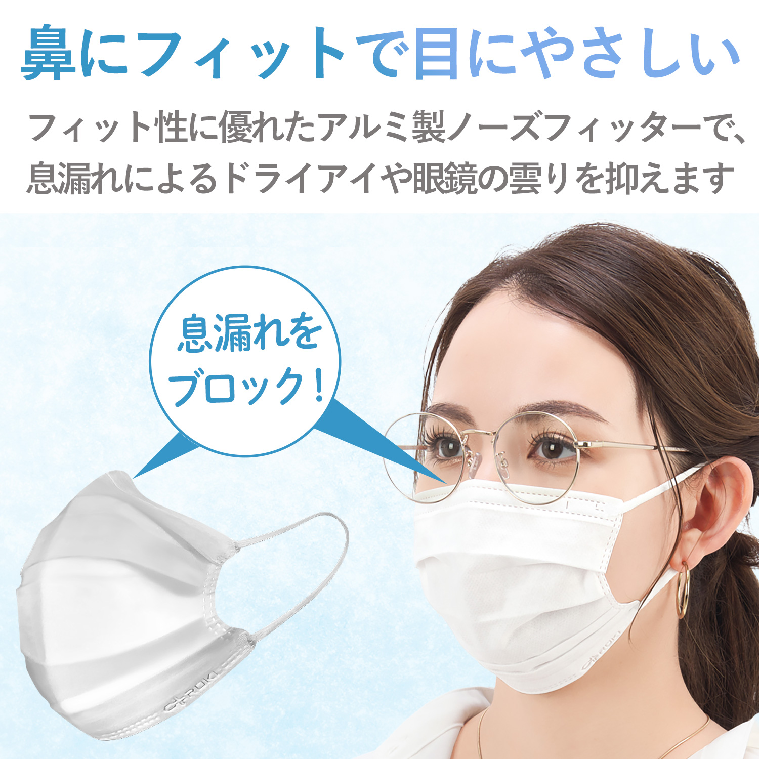 ・素材:本体(ポリプロピレン)、フィルター部(ポリプロピレン)、耳ひも部(ポリエステル・ポリウレタン)、ノーズフィッター(アルミニウム)