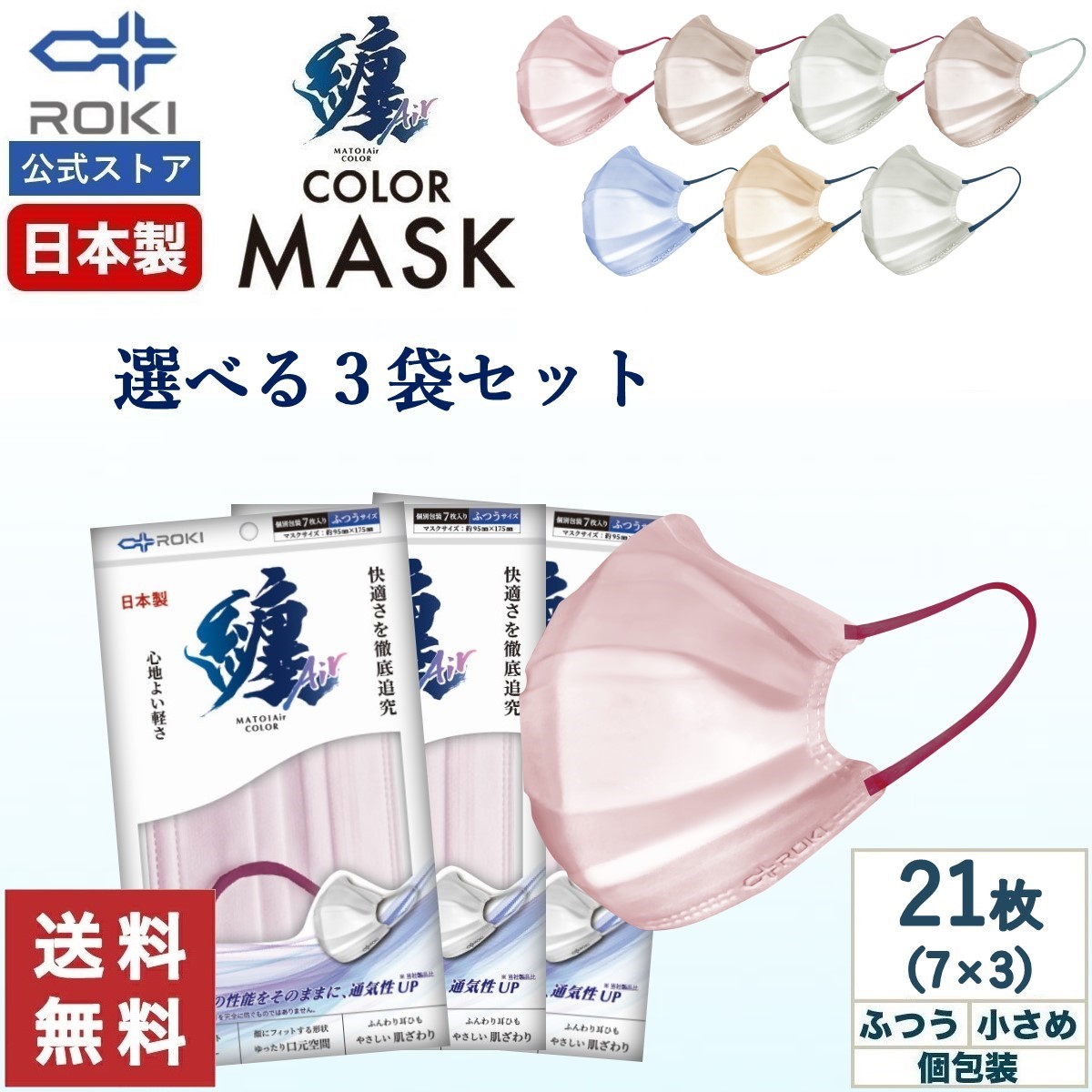 【最大P10% ~1/19 24時】通気性UP マスク 不織布 日本製 バイカラー 選べる7色 7枚入×3種類(21枚)ふつう/小さめ 個包装 公式 ROKI ロキ 纏Air