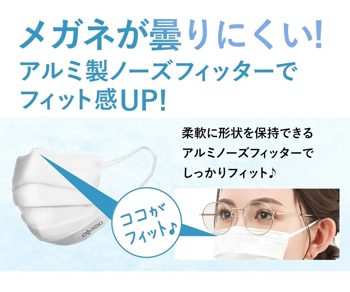 ・素材:本体(ポリプロピレン)、フィルター部(ポリプロピレン)、耳ひも部(ポリエステル・ポリウレタン)、ノーズフィッター(アルミニウム)