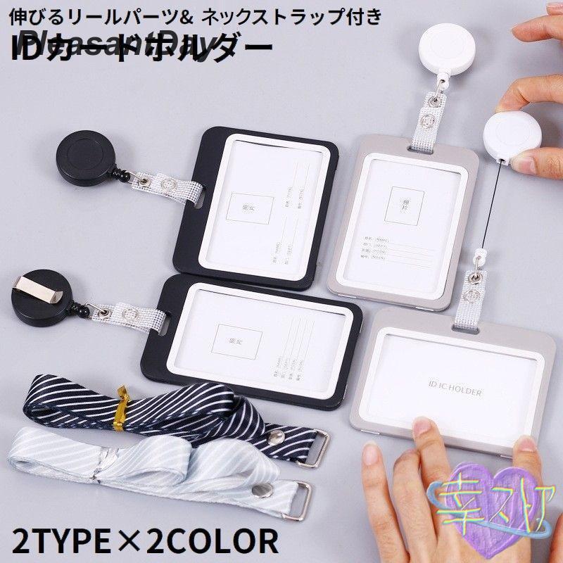 IDカードホルダー IDカードケース パスケース 縦型 横型 伸びるリール ネックストラップ付き 定期入れ 社員証 ビジネス シンプル シンプル ブラ