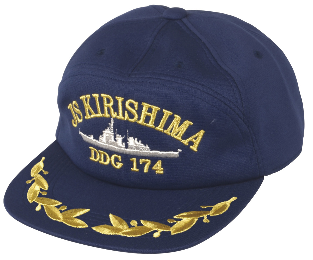 前面に「JS KIRISHIMA」 の文字、艦影と艦番号、つばに桜葉マークの金モールの刺繍入り。