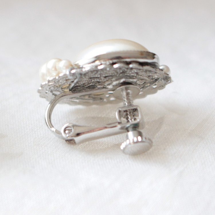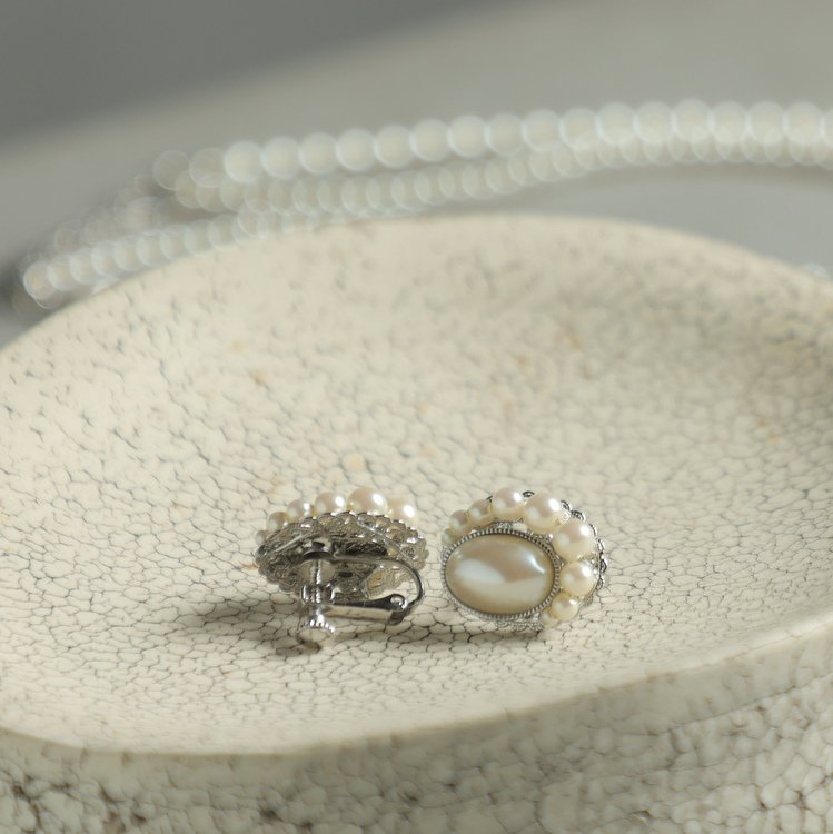 大粒のオーバル型パールと小粒のパールを贅沢にあしらったオーバルイヤリング。